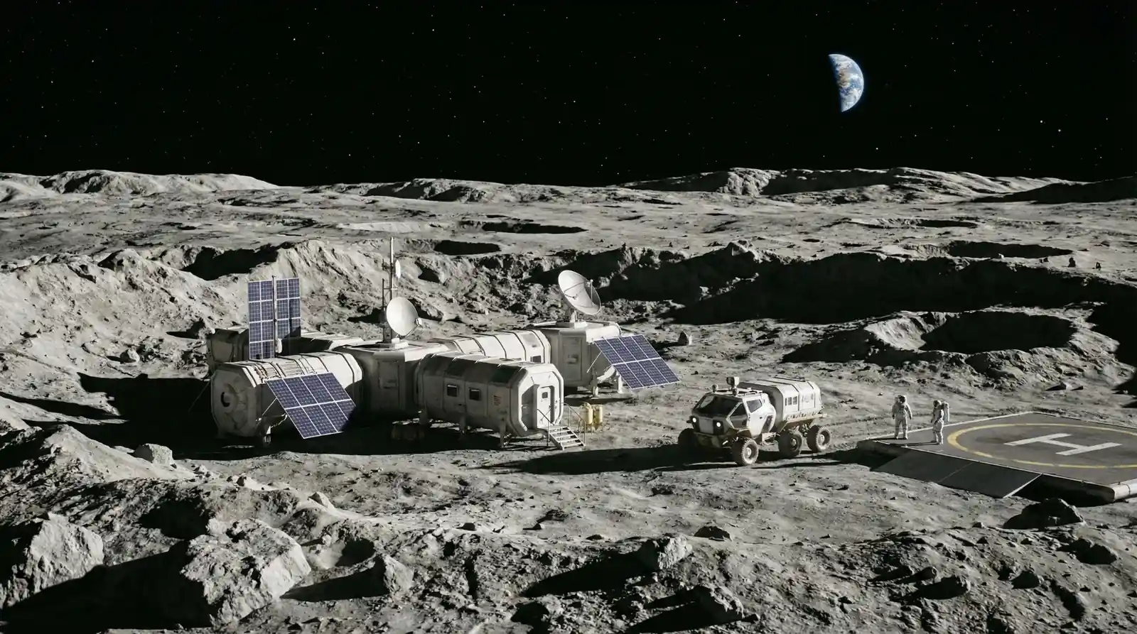 Sama izgradnja postaje gotovo sigurno ne bi krenula od astronauta s “lopatama”, nego od robota. Prve misije koristile bi satelite i autonomna vozila za detaljno proučavanje terena, potvrdu prisutnosti vode i označavanje područja bogatih resursima. Robotske letjelice mogle bi unaprijed pripremiti mjesta za slijetanje, izravnati tlo i rastaliti prašnjavu površinu u čvršće podloge kako bi se smanjila šteta koju pri slijetanju stvara izrazito abrazivna mjesečeva prašina.